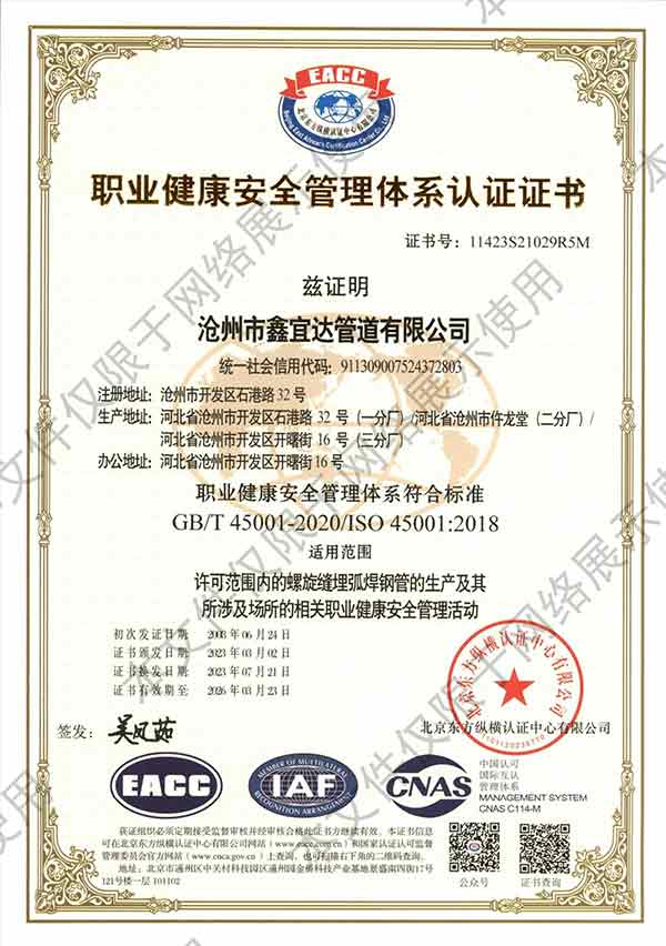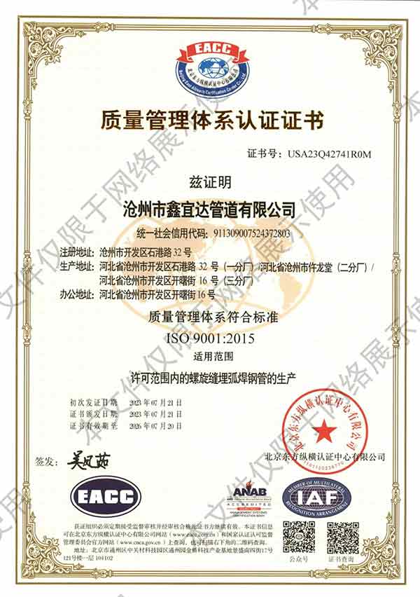 滄州市鑫宜達(dá)管道有限公司成立于2003年7月,坐落于滄州經(jīng)濟(jì)開(kāi)發(fā)區(qū),占地面積40萬(wàn)平方米,注冊(cè)資金1.81億元,是集螺旋鋼管生產(chǎn)、防腐加工以及無(wú)縫鋼管、卷板、帶鋼等品類(lèi)鋼材經(jīng)營(yíng)銷(xiāo)售于一體的工貿(mào)型企業(yè)。公司現(xiàn)有員工400多人,其中,中高級(jí)技術(shù)職稱的人員達(dá)120余名。 滄州市鑫宜達(dá)管道有限公司擁有9條螺旋鋼管生產(chǎn)線和3PE防腐生產(chǎn)線,可生產(chǎn)直徑219--3640mm,壁厚5.5--28mm,最高鋼級(jí)X100的各種規(guī)格防腐螺旋鋼管...